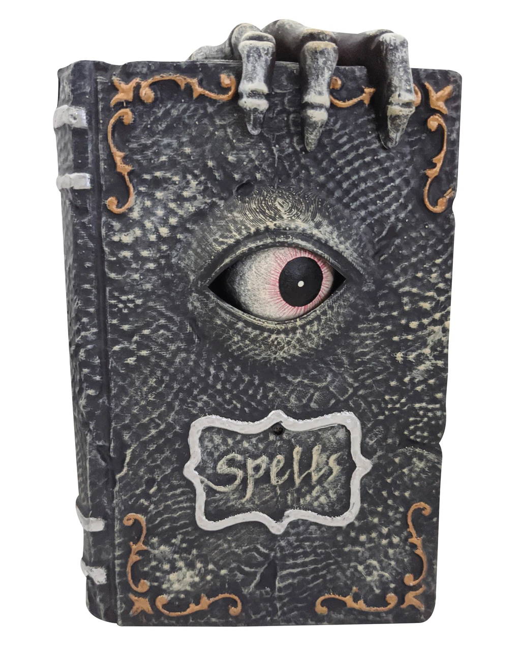 Unser animiertes Hexenbuch mit Drachenauge sorgt für Gänsehaut. Lege die schaurige Halloween Tischdekoration so hin, dass sie jeder sehen kann. Das unheimliche Aussehen des Zauberbuches wird dafür sorgen, dass man sich neugierig nähert. Nicht ahnend, dass man es mit einem absoluten Grusel Highlight zu tun bekommen. Das Buch muss verzaubert sein. Das Auge leuchtet und bewegt sich in dem Buch. Wie kann das möglich sein. Und dann diese grausigen Geräusche. So mancher spitze Schrei des Schreckens wird an diesem Abend ertönen. Gönne dir diesen Gruselspaß und bringe deine Freunde mit diesem originellen Halloween Animatronic ins Schwitzen.