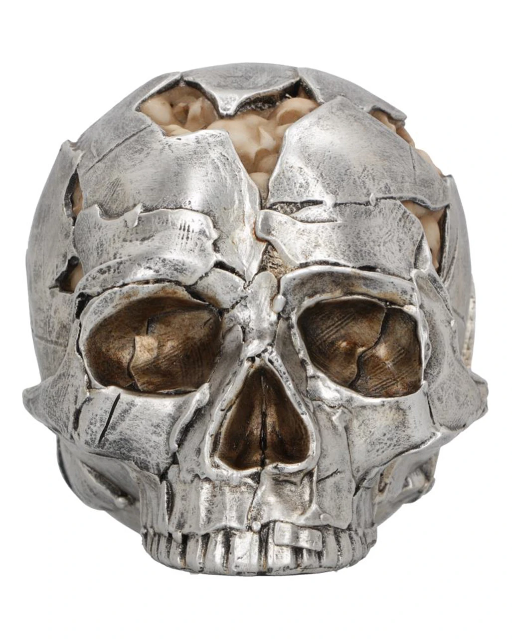 Cooler, aus Metallfetzen geformter Totenschädel. In den aufgeplatzten Rissen erscheinen zum Teil kleinere Schädel, die sich auf der Schädeldecke gebildet haben und einen Gehirn-Effekt erzeugen.