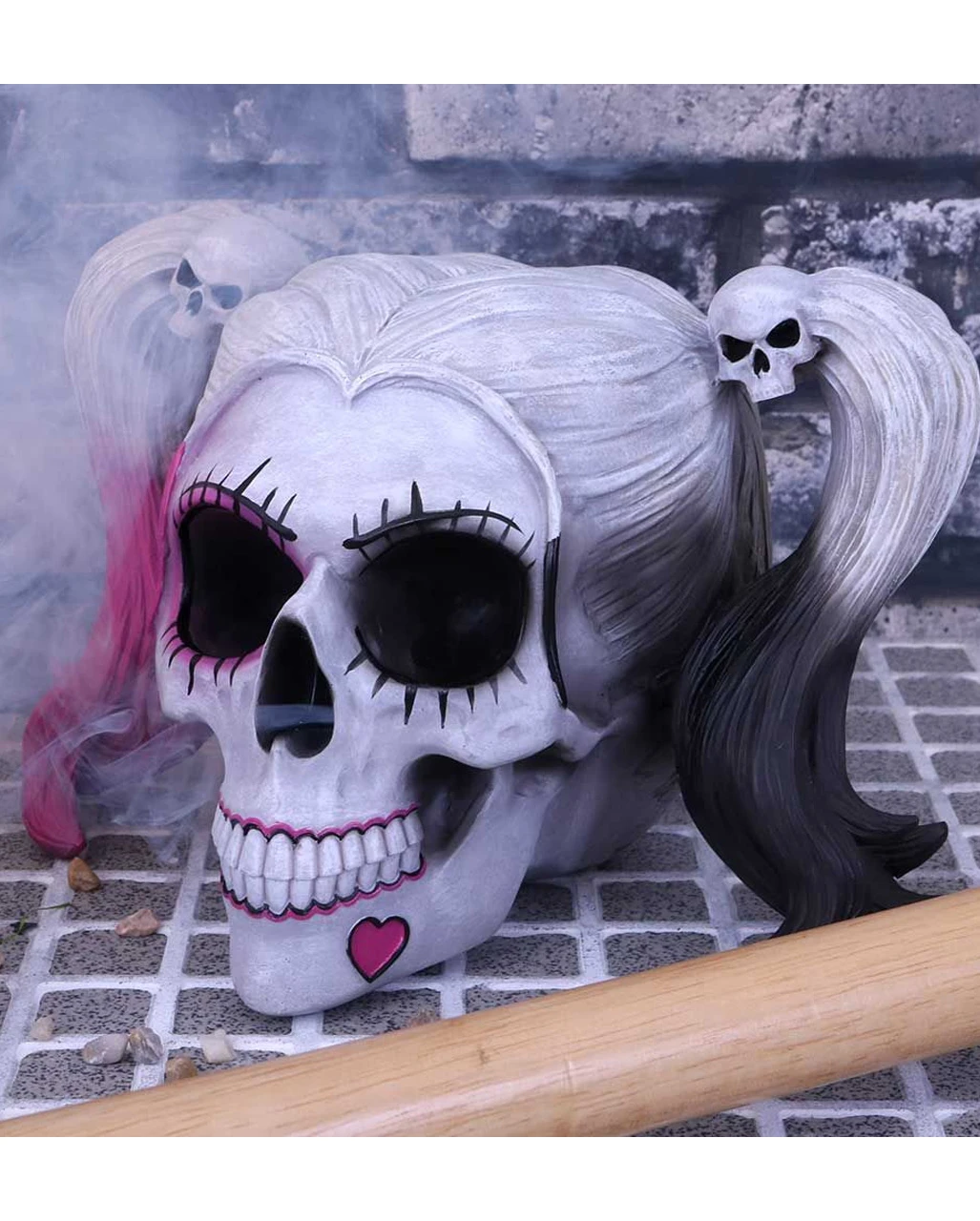 So kennen und lieben wir die durchgeknallte Schurkin Harley Quinn! Daddy´s lil´Monster sorgt auch nach ihrem Ableben für Stress! Mit dem Little Monster Totenkopf kannst du dir Harley Quinn als Tischdeko gönnen. Der Totenkopf mit Zöpfen ist aus Kunststein gegossen und kommt im farbenfrohen Cavalera Design – das perfekte Geschenk für Comic-Fans!