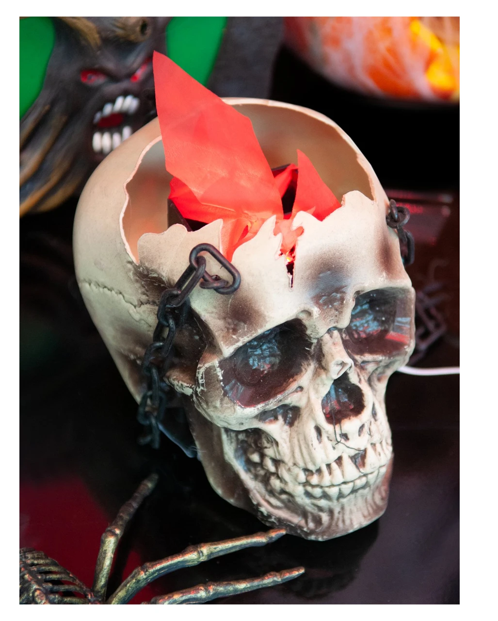 Die Totenkopf LED Flammenschale ist ca. 45 x21 x 15 cm groß und sehr detailliert gearbeitet. Ein realistischer Totenschädel hängt an einer Kette, welche du an der Decke oder Wand befestigen kannst. Im Inneren des Schädels befinden sich LED Lampen, welche bei Betrieb, wie eine lodernde Flamme aussehen. Ein gruseliges Lichtspiel für Totenkopf- und Halloween-Fans! Es werden 4 x AA 1,5V Batterien benötigt, nicht inkl. Für den Gruseleffekt mit zusätzlichem Sound empfehlen wir Sprechender Totenschädel Animatronic beleuchtet