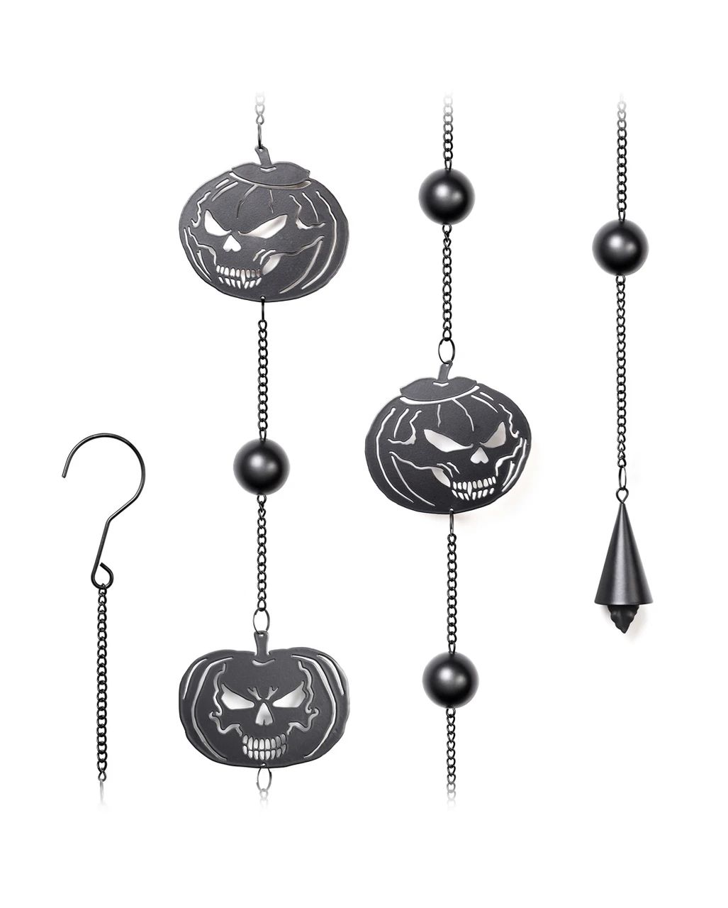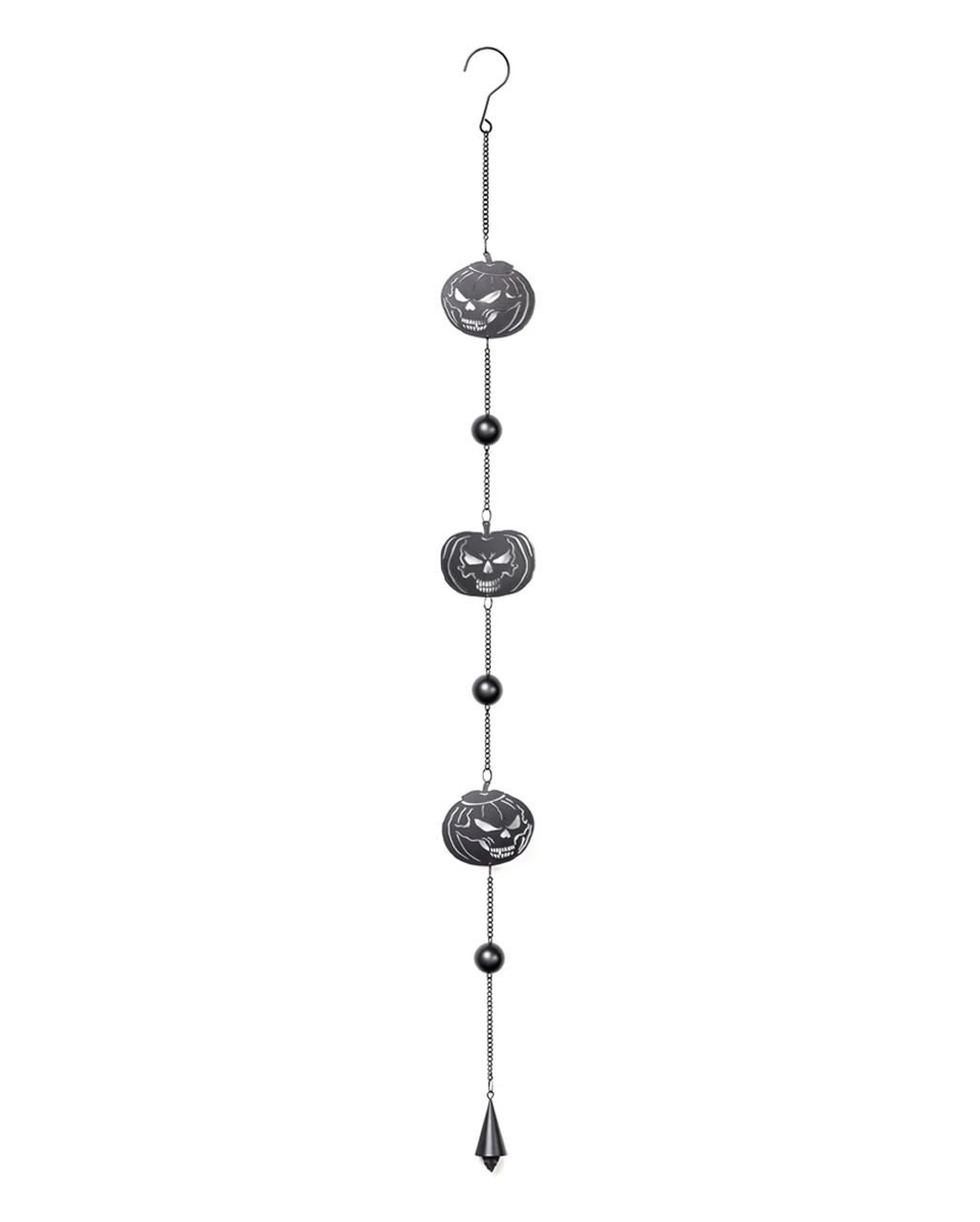 Windspiele sind oftmals an Eingangstüren und auf Balkonen anzutreffen. Sie dienen nicht nur der Bestimmung der Windrichtung, sondern sollen sich durch ihren harmonischen Klang auch positiv auf das Wohlbefinden auswirken. Mit unserem Totenschädel Kürbis Windspiel Hängedeko schmückst du deinen Außenbereich im Grusel Look. Das Halloween Windspiel zeigt aneinander aufgereihte Kürbisse mit bösen Fratzen. Nutze das Windspiel als Horror Deko zum Hängen oder als Gothic Wohnaccessoire für den Innenbereich.