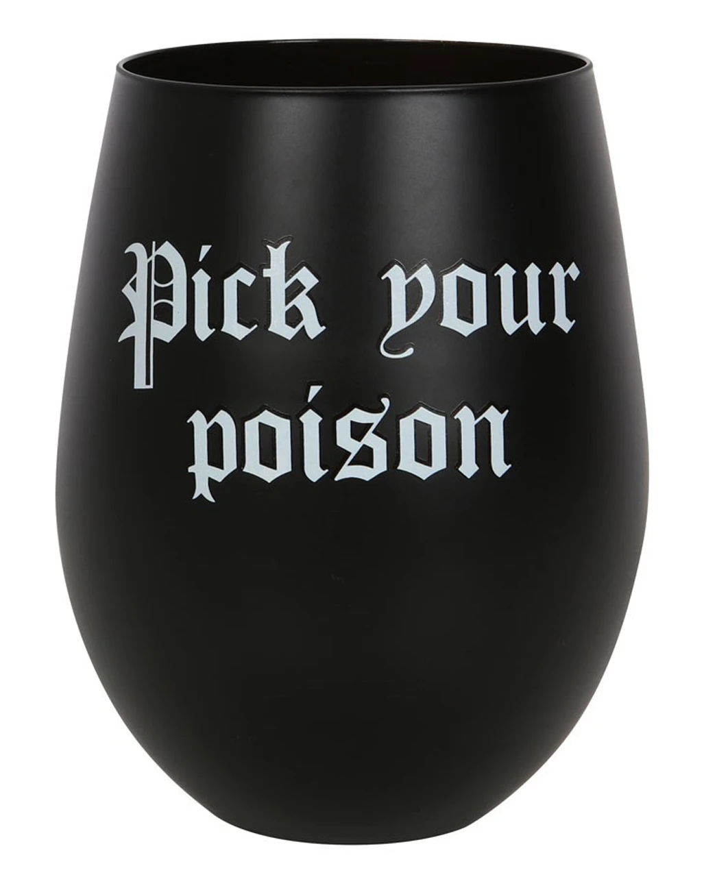 Das „Wähle dein Gift“ Weinglas ist ein schwarzes Glas ohne Stiel. Es kommt mit weißem Schriftzug, der auf dem schwarzen Hintergrund super hervorsticht. das Halloween Poison Glas fasst ca. 500 ml. Achtung! Nicht für Mikrowelle und Spülmaschine geeignet. Nur per Hand waschen! Entdecke noch mehr Halloween Geschirr wie Gläser, Krüge, Becher und den Bone Appetit Trinkbecher 8 Stück.